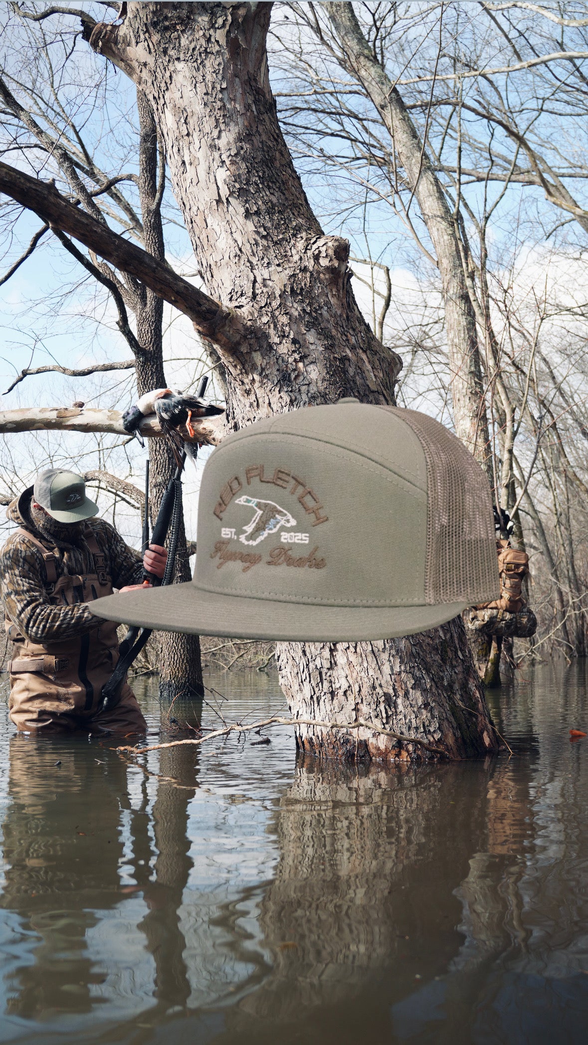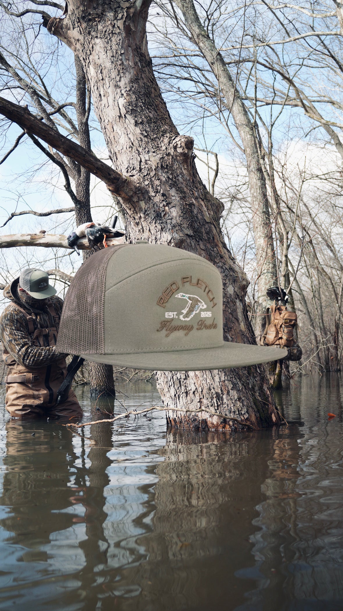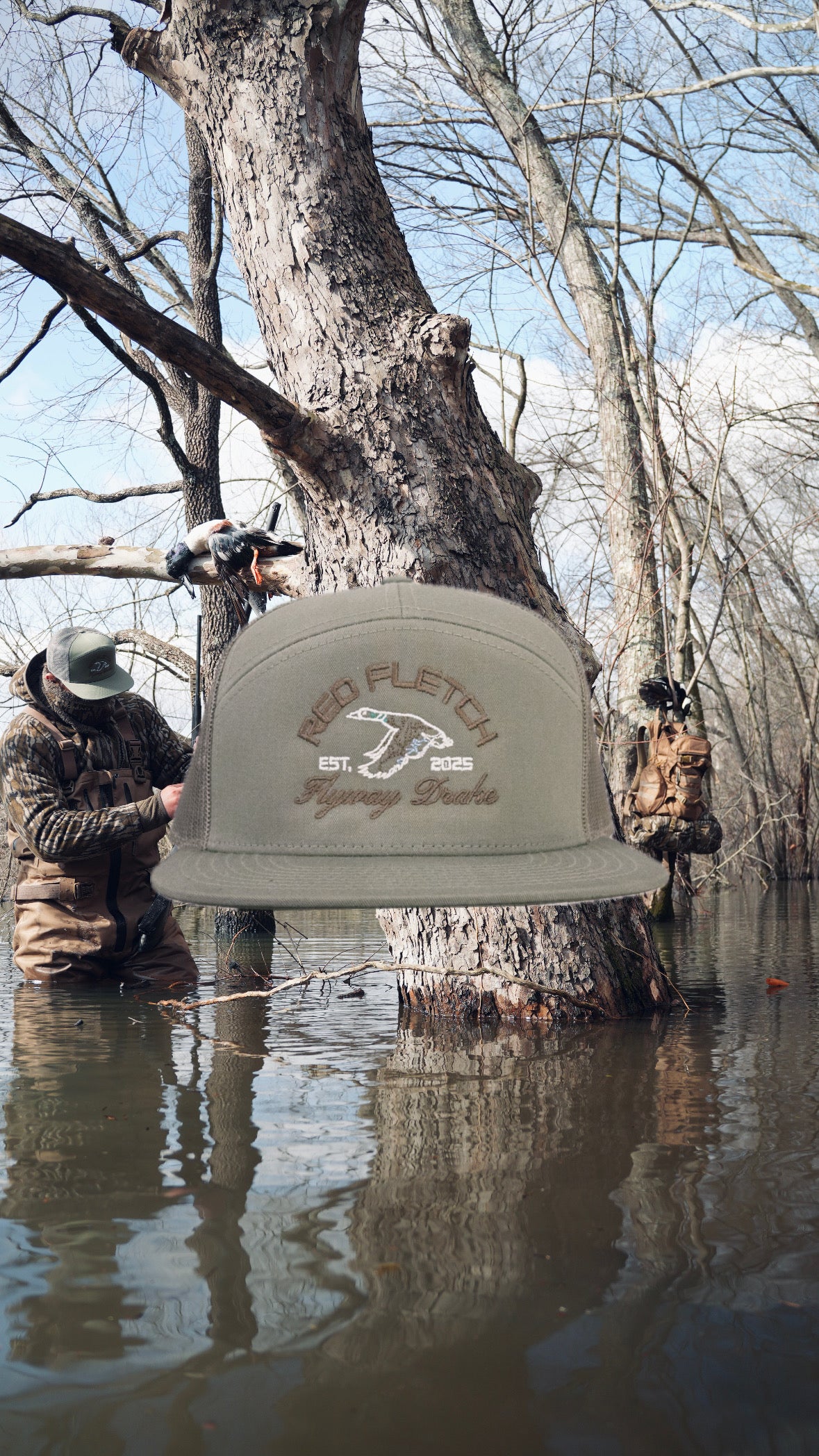 Above the artwork, “Red Fletch” arches in bold brown lettering, while “Flyway Drake” rests below in elegant cursive, completing the premium look. The design itself features a striking white flyway drake, with brown, blue, and green rivers mimicking the iconic drake mallard pattern—bringing the outdoors straight to your wardrobe.